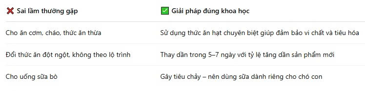 Tránh thức ăn của người: Gây rối loạn tiêu hóa, béo phì hoặc thiếu vi chất thiết yếu.